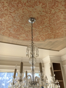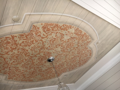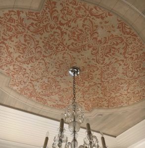 Two summers ago a building contractor friend asked me if I could paint a dining room ceiling for him in his new home near Folly Beach. After discussing a preferred color scheme, we decided that a Damask stencil design would be most appropriate. The Damask pattern has often been thought of originating form Damascus, Spain however its true origin is from China during the Byzantine empire and made its way to Europe in the 14th century. A silk or twill fabric weave has now been sometimes replaced with a modern day replica that decorative painters use with paint. I often apply several layers of thin translucent paint glazes to the wall before i even get to the Damask stencil.