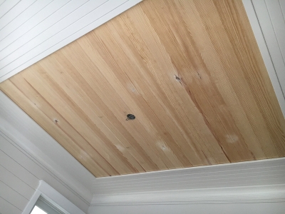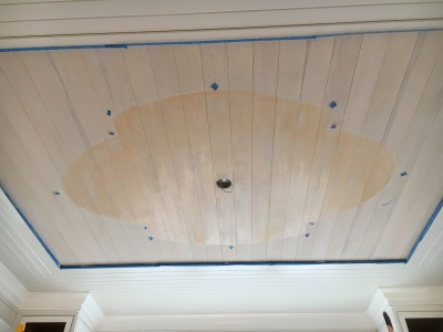 My clients ceiling was originally installed with a common raw pine wood. I first took measurements of the ceiling space to determine scale of the design. I then made a sketch on graph paper for a few preliminary visuals of how this design would look. I made a few 2 foot by 2 foot sample boards to get a visual to hold up to the ceiling for color and design. Painting a ceiling is always a beautiful endeavor, but getting there presents a more arduous effort. Gravity is not something I have to think about when painting a floor, but on a ceiling one almost needs four hands.